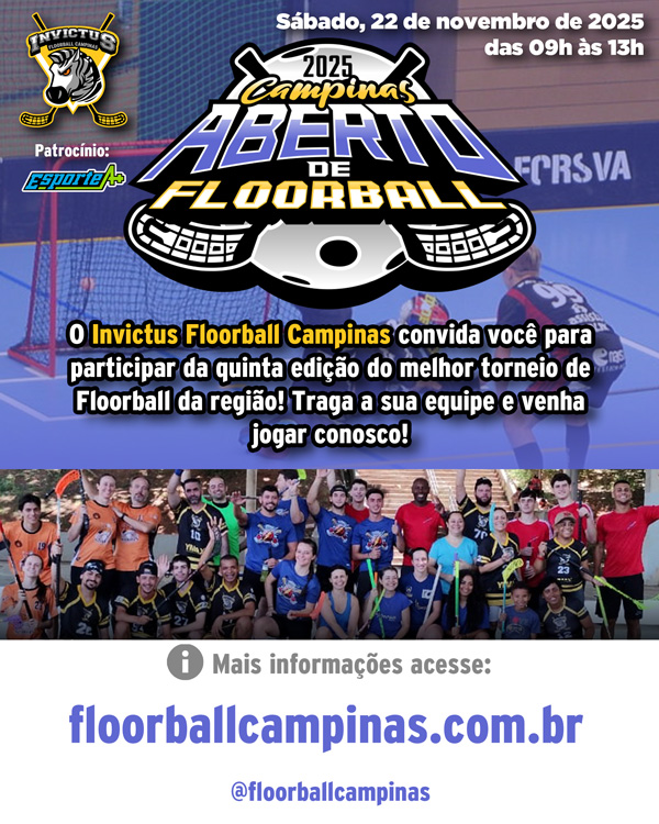 No dia 22 de Novembro de 2025, sábado, das 09h às 13h ocorrerá o Aberto de Floorball Campinas 2025, o maior e melhor evento de floorball da região em sua quinta edição.